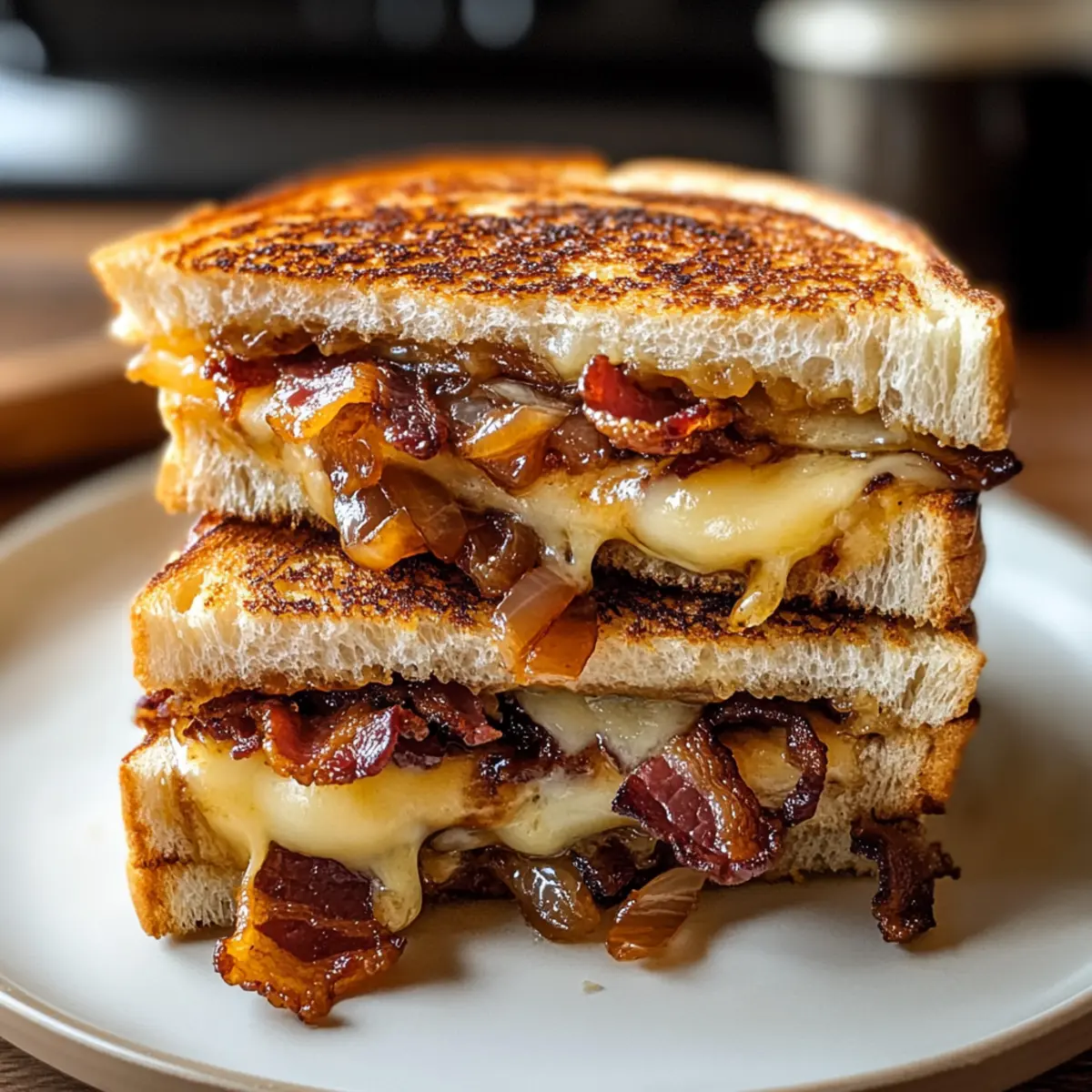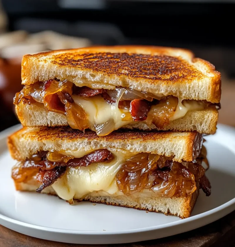 Herzerwärmende Momente: Diese Bacon und karamellisierte Zwiebel gegrillten Käsesandwiches bringen Komfort und Freude auf den Tisch, ideal für kalte Tage.