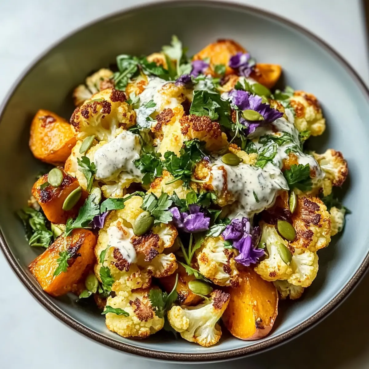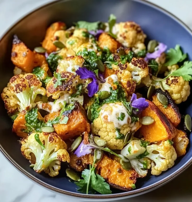 Entdecke den Curry-gerösteten Blumenkohl-Süßkartoffel-Salat Rezept, der deine Geschmacksknospen auf eine Reise indischer Aromen mitnimmt!