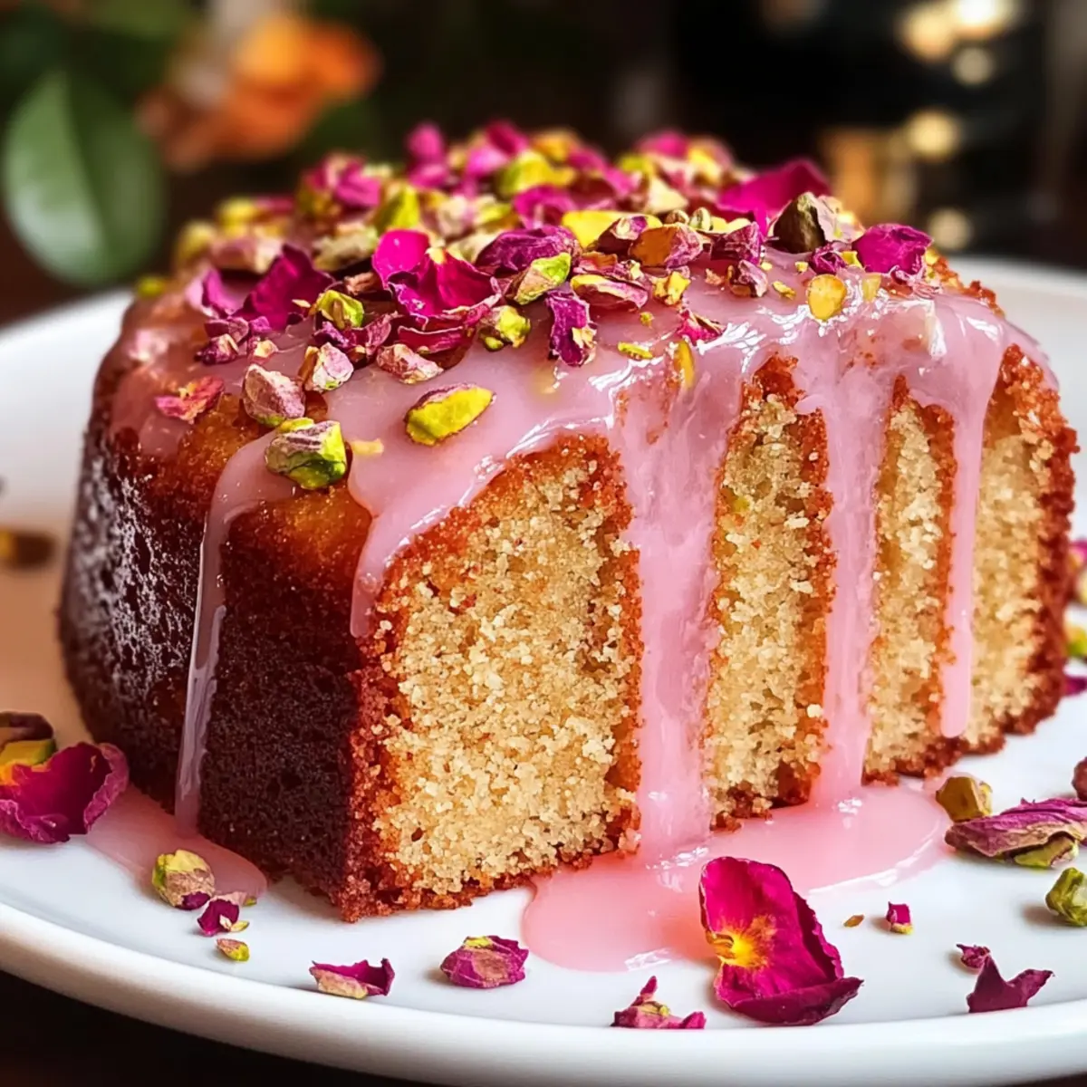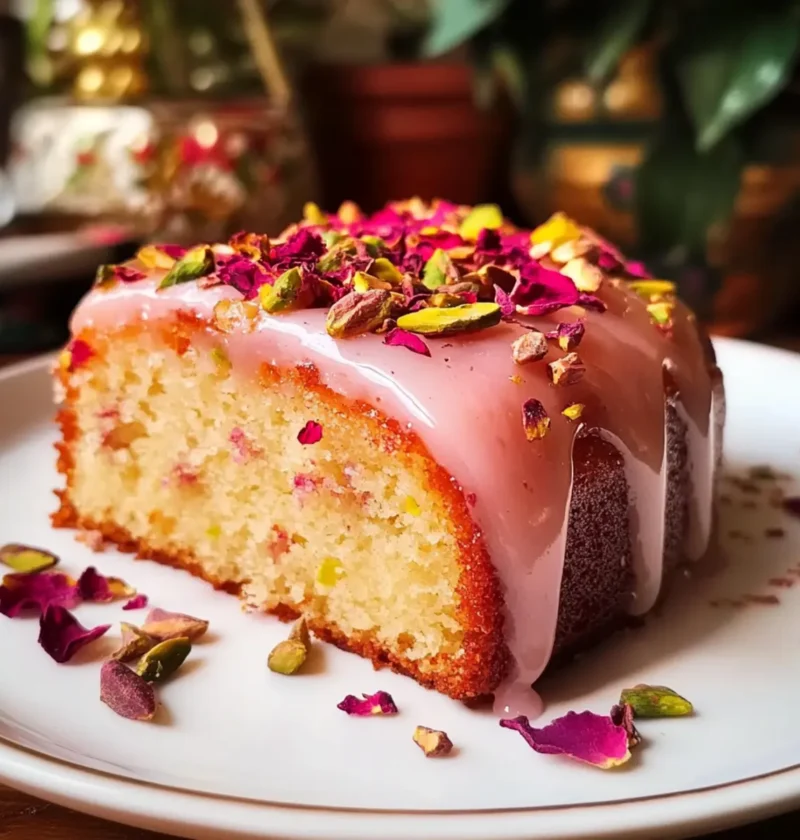 Festliche Anziehungskraft: Mit dem verzierten Topping aus Pistazien und getrockneten Rosenblättern wird dieser Kuchen zum Blickfang auf jedem Tisch. Jeder Bissen sorgt für Neuigkeiten und Begeisterung unter Ihren Gästen!