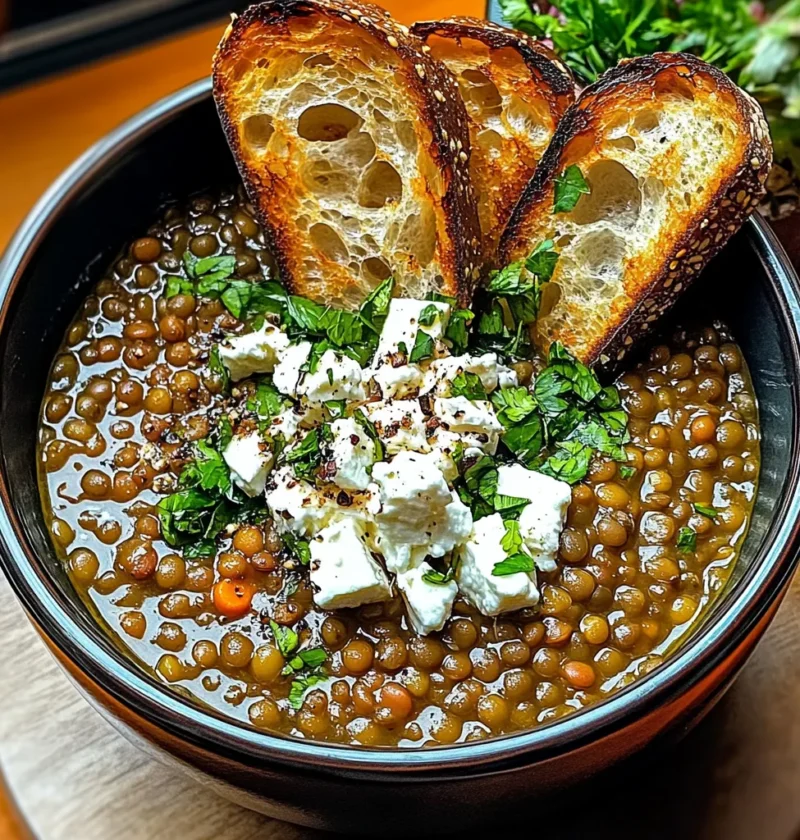Diese herzhafte französische Linsensuppe verbindet rustikale Küche mit aromatischen Kräutern und einer cremig-warmen Textur. Grüne Linsen entwickeln beim Köcheln eine satte, erdige Note, während aromatisches Gemüse, Thymian, Rosmarin und ein Hauch Tomatenmark für Tiefe sorgen. Der frische Kontrast durch Feta und das goldbraune Knusperbrot macht die Suppe zu einem vollständig abgerundeten Gericht.
