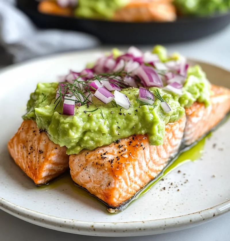 Nehme den Lachs aus dem Ofen und lasse ihn kurz abkühlen. Platziere die Lachsfilets auf Tellern und gebe dann großzügige Löffel des cremigen Avocado-Pürees darauf. Garniere das Gericht nach Belieben mit fein gehackten roten Zwiebeln und weiteren Dillspitzen für einen frischen, ansprechenden Look.