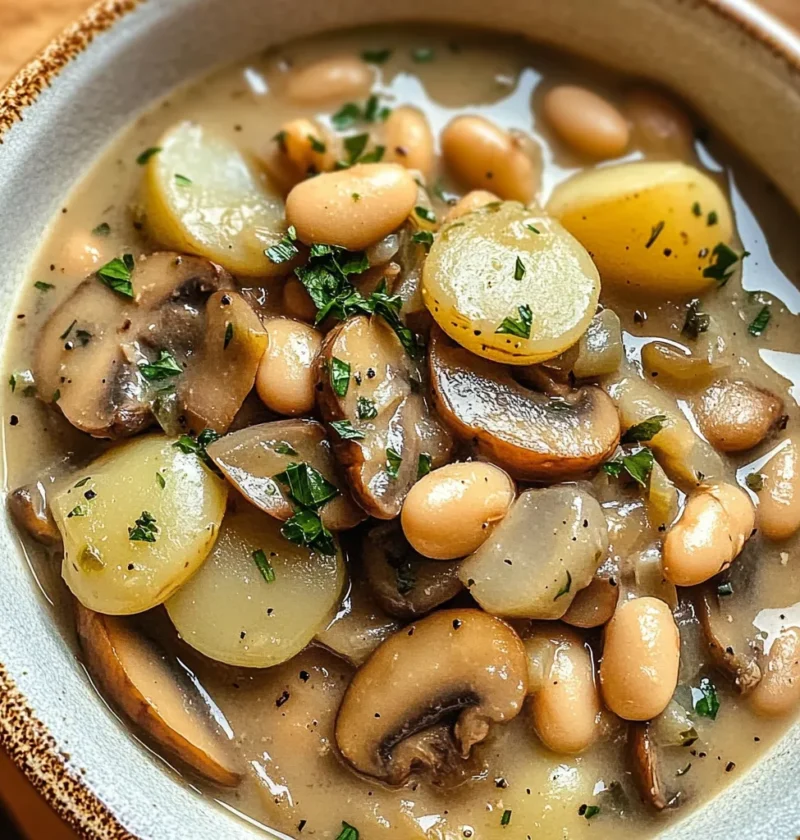 Der Eintopf kombiniert sautierte Champignons und Zwiebeln mit gewürzten Kartoffeln, cremigen weißen Bohnen und pflanzlicher Milch. Maisstärke sorgt für eine sämige Konsistenz, während Tamari und Dijon-Senf das Aroma abrunden. Einfach, nahrhaft und wärmend – ein veganes Wohlfühlessen für jede Jahreszeit.
