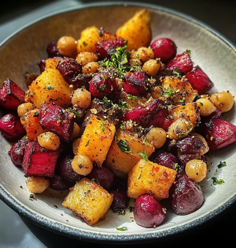 Dieses einfache Gericht vereint die intensive Süße der Roten Bete mit dem nussigen Geschmack von Kichererbsen und der Würze von Knoblauch und Thymian. Es wird alles zusammen auf einem Blech geröstet, wodurch sich die Aromen perfekt miteinander verbinden. Ein unkompliziertes, gesundes Ofenrezept, das für Anfänger ebenso geeignet ist wie für erfahrene Hobbyköche.
