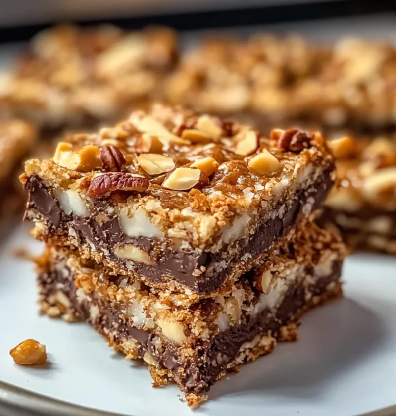 Verteilen Sie die Schokoladenstückchen gleichmäßig über die Kruste. Darüber streuen Sie die geraspelte Kokosnuss und die gehackten Walnüsse oder Pecannüsse. Diese Schichten bilden das Herzstück der Riegel, das Vielfalt in Textur und Geschmack bringt und jeden Biss magisch macht.