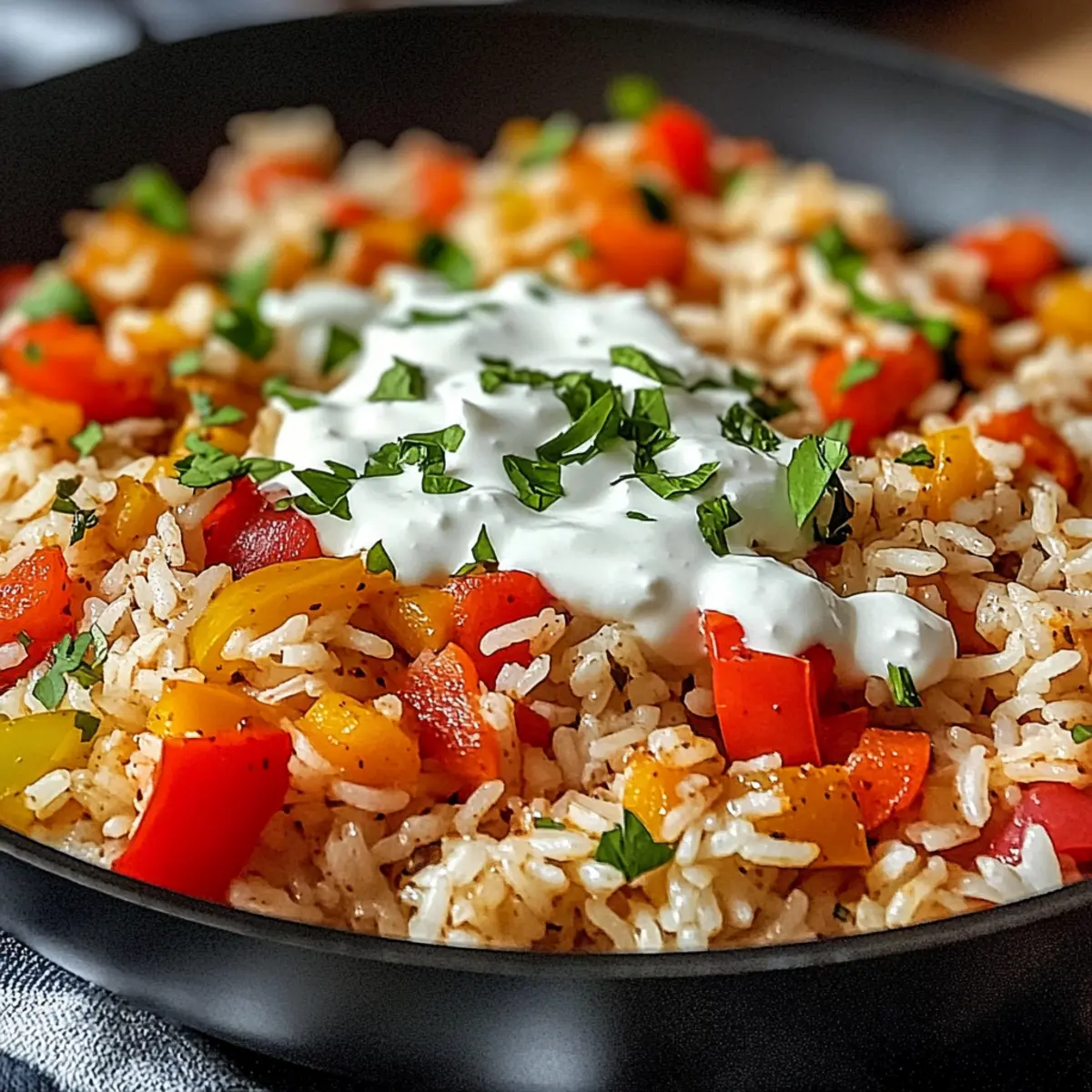 - Servieren: Paprika-Reis-Pfanne mit Joghurtsoße anrichten und genießen.