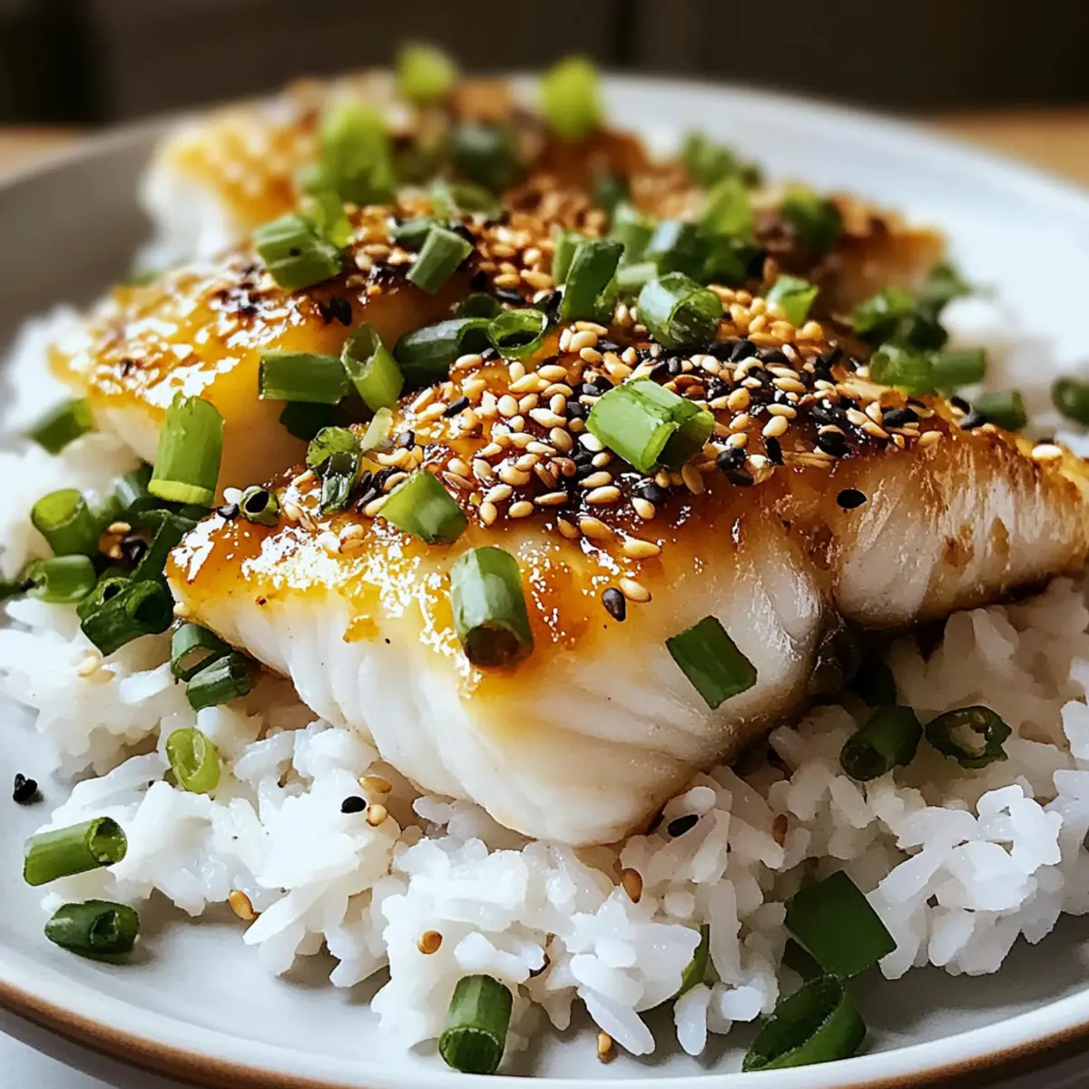 - Fluffe den klebrigen Reis mit einer Gabel auf und serviere ihn auf Tellern, platziere den glasierten Schellfisch darauf. Garniere mit Frühlingszwiebeln und Sesamsamen.