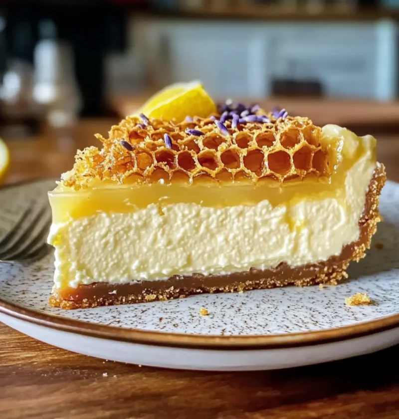 Vor dem Servieren zerkleinere die Honigwabe und streue sie über den Käsekuchen. Du kannst auch einen Schuss Honig und einige dekorative Lavendelblüten sowie Zitronenschale hinzufügen, um das Aussehen zu verfeinern. Schneide das Stücke und genieße den ultimativen Zitronen-Lavendel-Käsekuchen – ein wahrer Genuss!